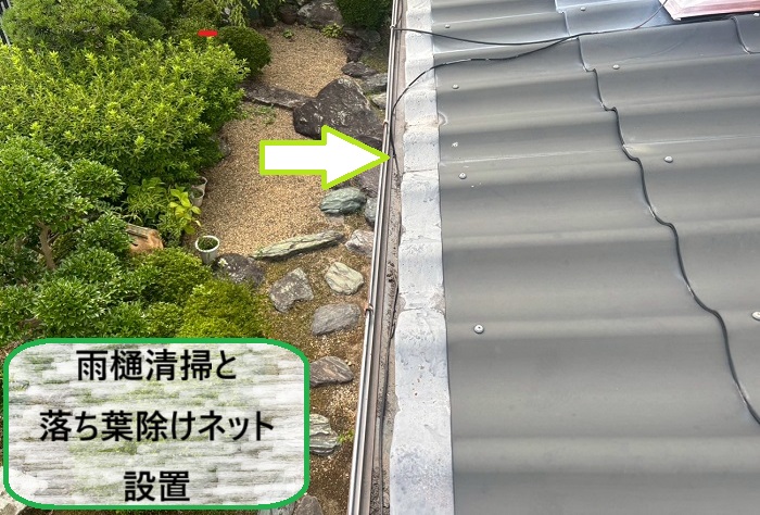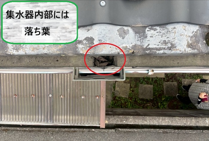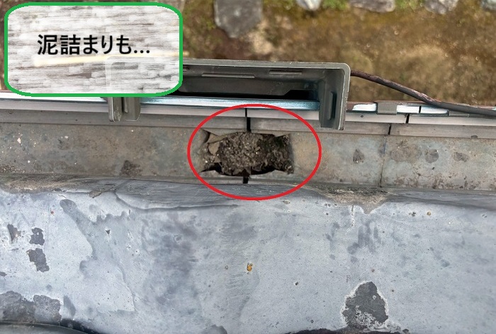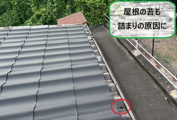 原因は屋根に繁殖した苔が雨で流れ落ち、時間をかけて少しずつ樋の中に溜まってしまったこと!