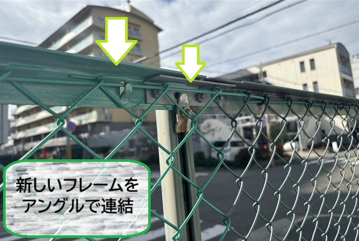 既存のフレームと新しいフレームは、アングル材を使って連結🔨
