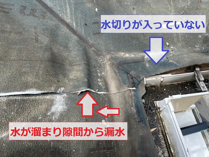 屋根の先端には、本来『軒先水切り』と呼ばれる板金材を取り付け、防水シートを伝ってきた雨水を正しく雨樋へ導く必要があります。