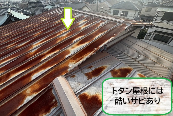 屋根には金属屋根が使用されており、経年による老朽化で錆の発生が確認できる状態でした🔍