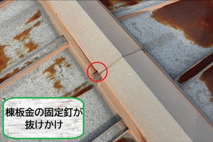 釘が抜けたままになると棟板金が浮き、飛散する危険性も高まるため注意が必要!