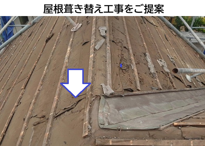 まず既存の屋根材を撤去し、下地の野地板や防水シートを確認します🔍