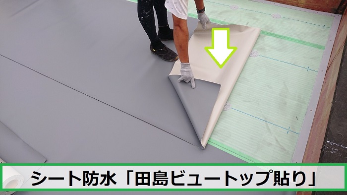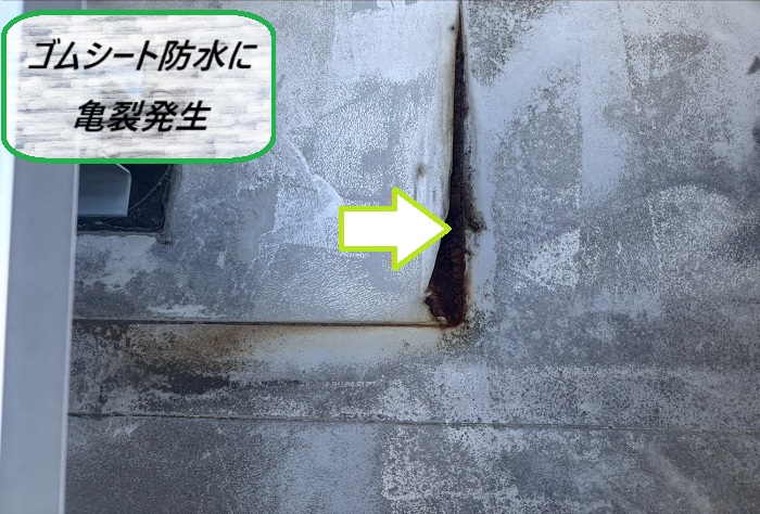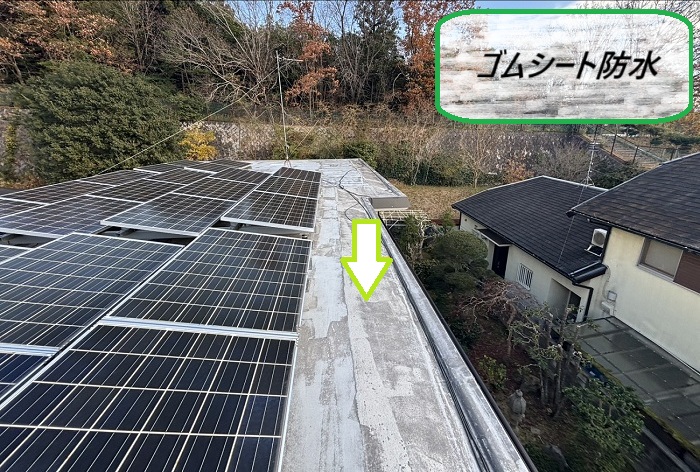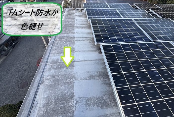 今回の小野市の現場では、陸屋根のゴムシート防水が色褪せており、経年劣化が進んでいる状態でした(。>﹏<。)