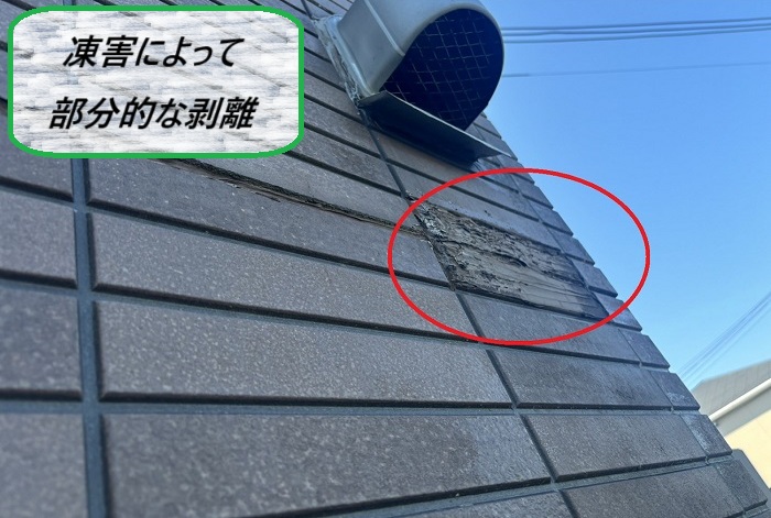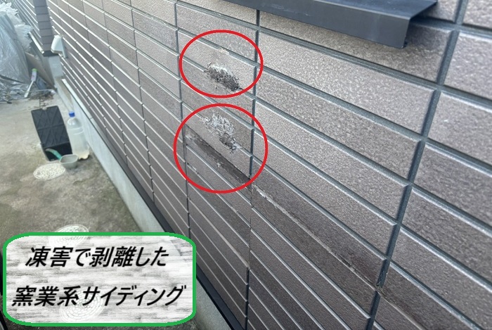 特に北側の外壁で凍害の影響が強く出ており、指で押すと素材がポロポロと崩れてしまう状態に💥