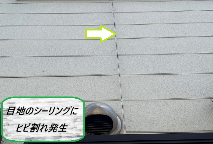 外壁の窯業サイディング目地に充填されているシーリング材は、経年劣化によって硬化やひび割れが起こっていました(´・ω・`)