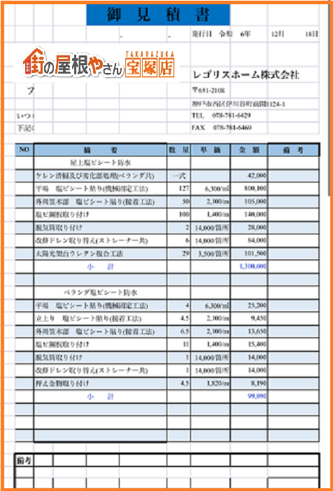 三田市 【見積書大公開】屋上に塩ビシート防水 機械固定工法で施工(面積120㎡)