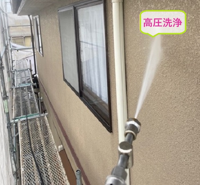 高圧洗浄機で外壁の汚れや古い塗膜、ホコリなどをしっかり落とすことで、塗料の密着性と耐久性がぐんとアップ。