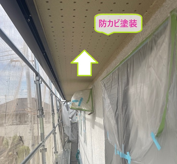 まずは黒カビが発生していた軒天に、防カビのつや消し塗料を二度塗りしてしっかり乾かします。